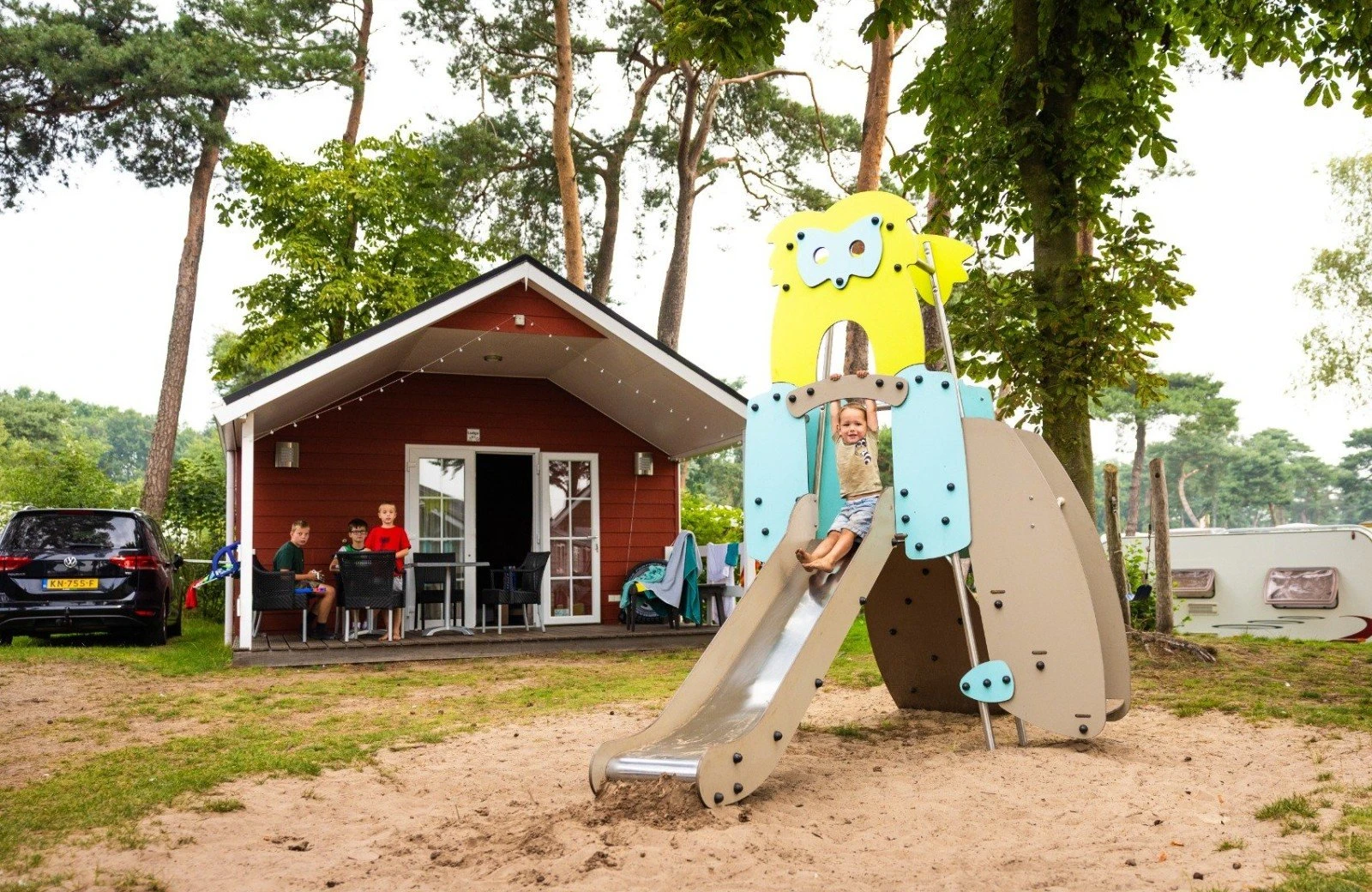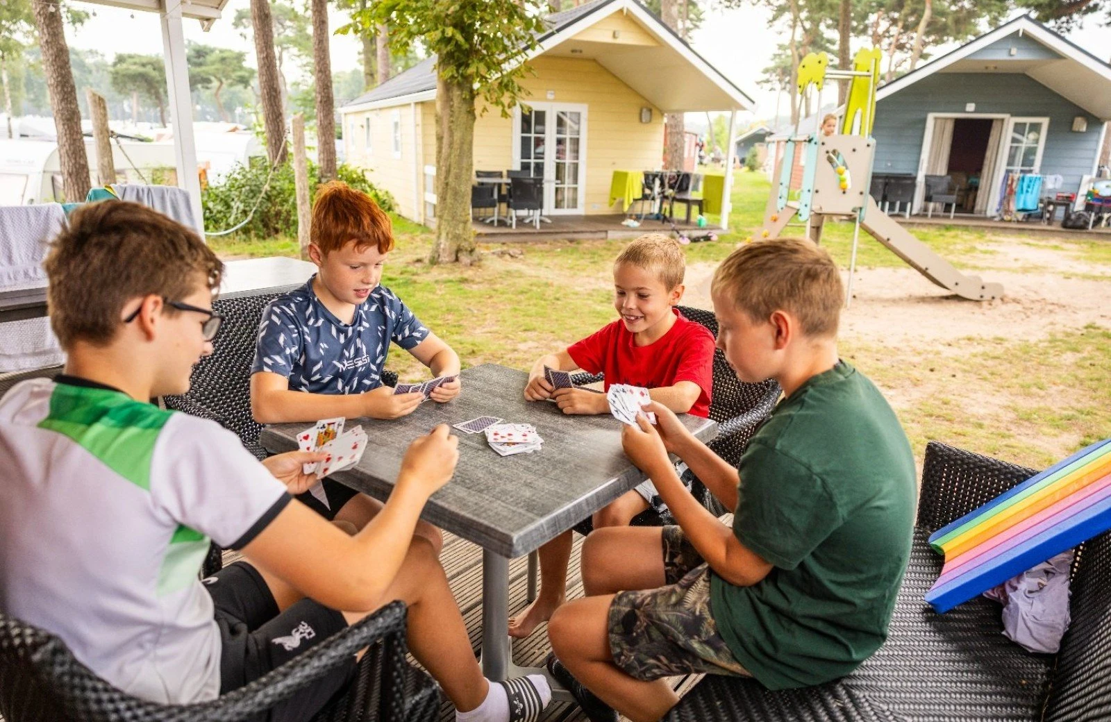 Enjoy a drink on the covered veranda in the sun, overlooking a playground. Now that's a holiday!