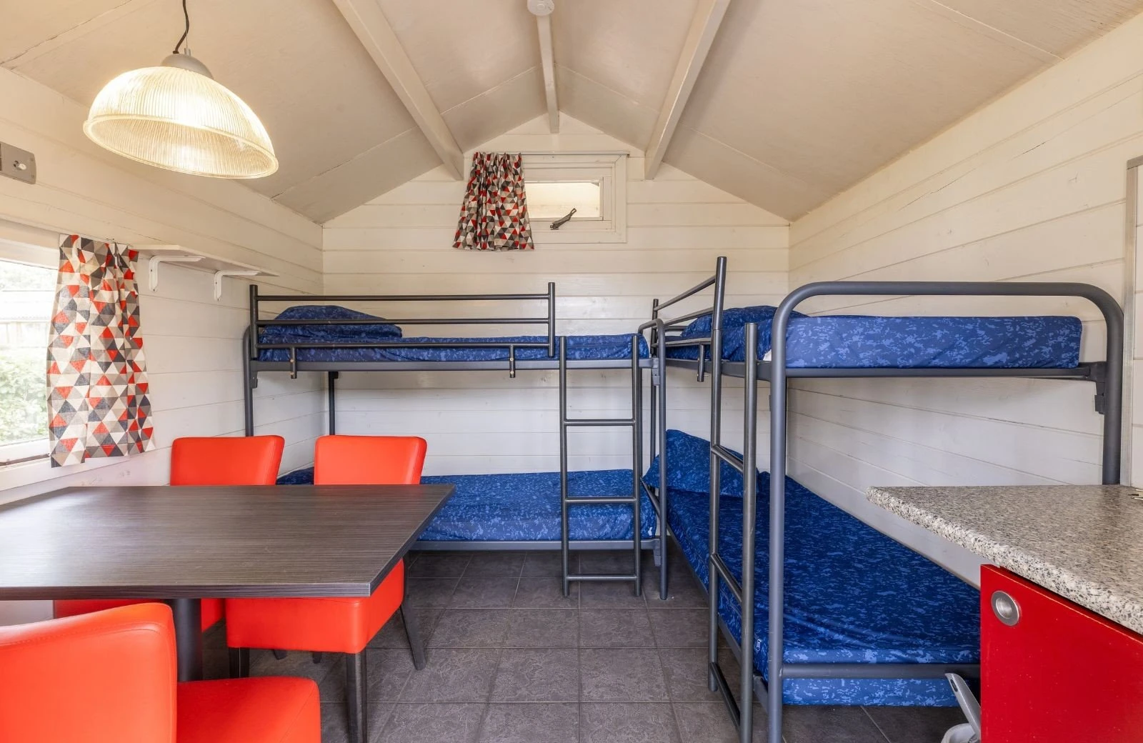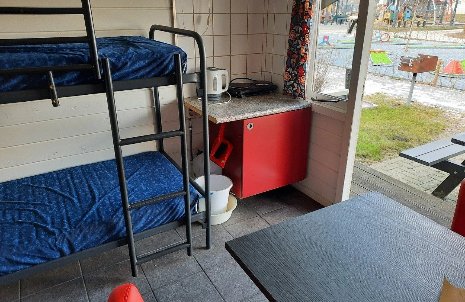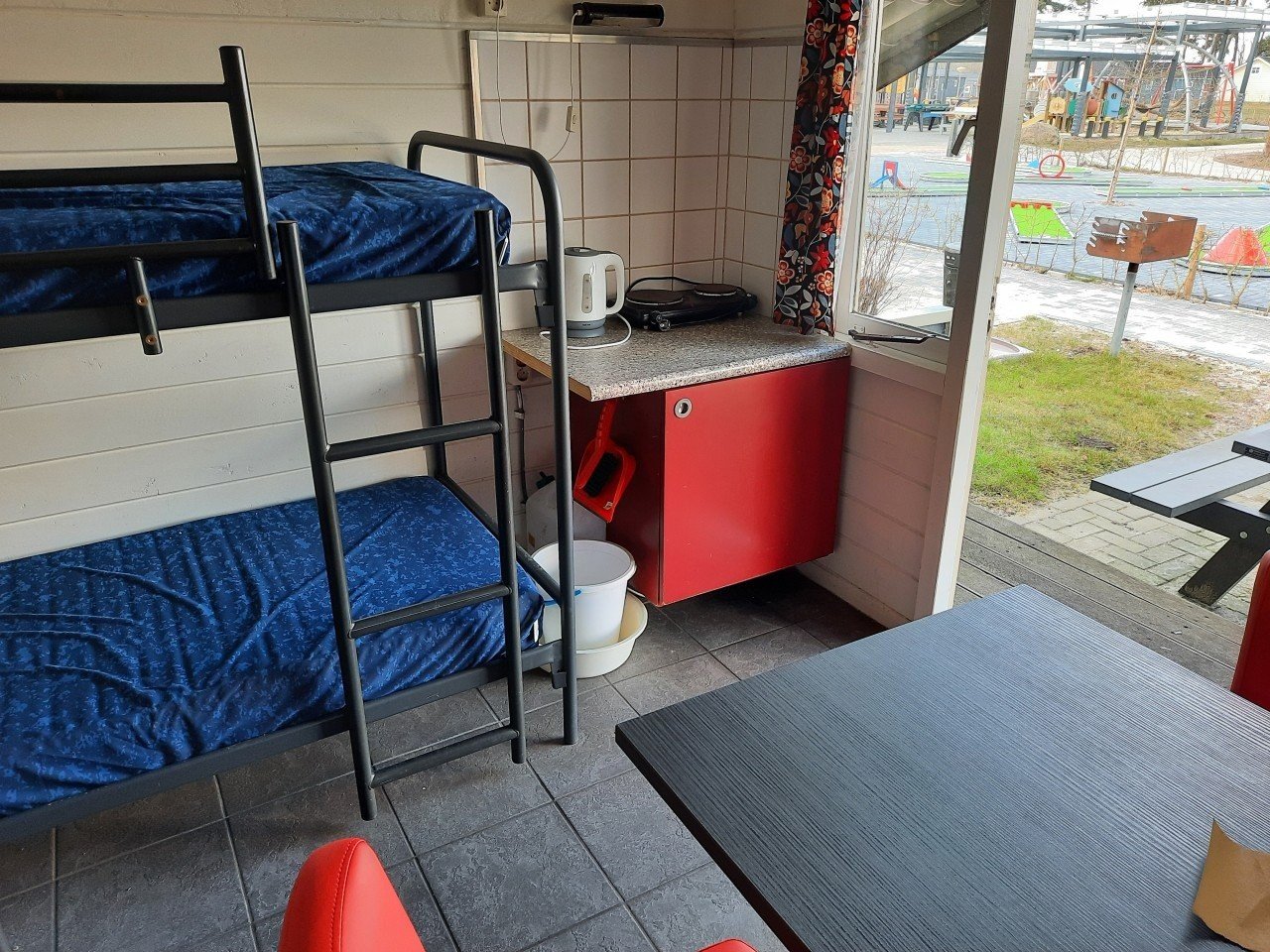 The camping cabin is simply furnished with two bunk beds, a dining area with 4 chairs and basic amenities such as a small fridge, two electric hotplates, a heater and a kettle. Outside there is a picnic bench so you can enjoy eating in the open air. The sanitary building is close by, as the cabin has no own toilet or shower.